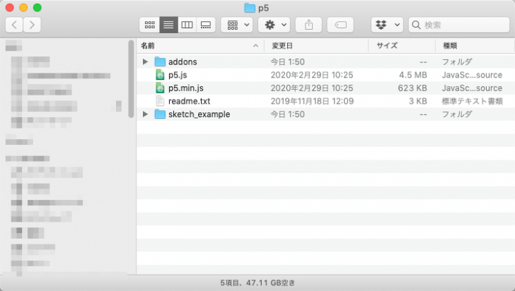 この「p5」というフォルダは、公式サイトの「Download」の「Complete Library」からダウンロードできるものの中に、調整済みの空のスケッチフォルダ「sketch_example」を入れたものです。これが今後自分で作る様々なスケッチのテンプレートになっていきます。
